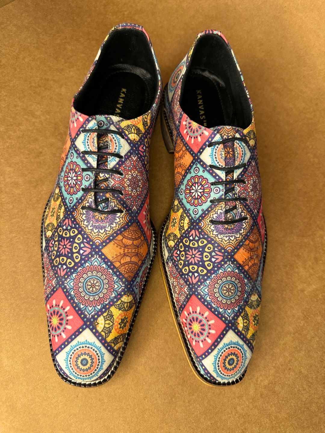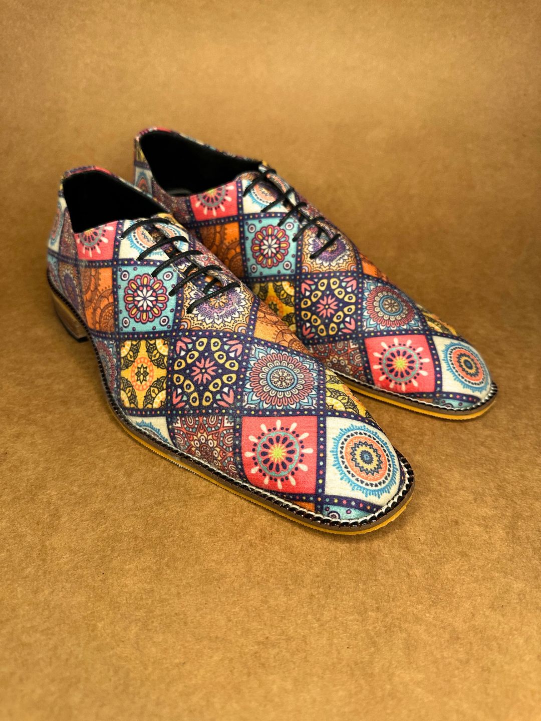 Introducing the Bhil Work Mandala Tappered Shoes - a classy and unique addition to your shoe collection. These lace-up shoes provide comfort and style, perfect for any occasion. Upgrade your footwear game with these must-have shoes.