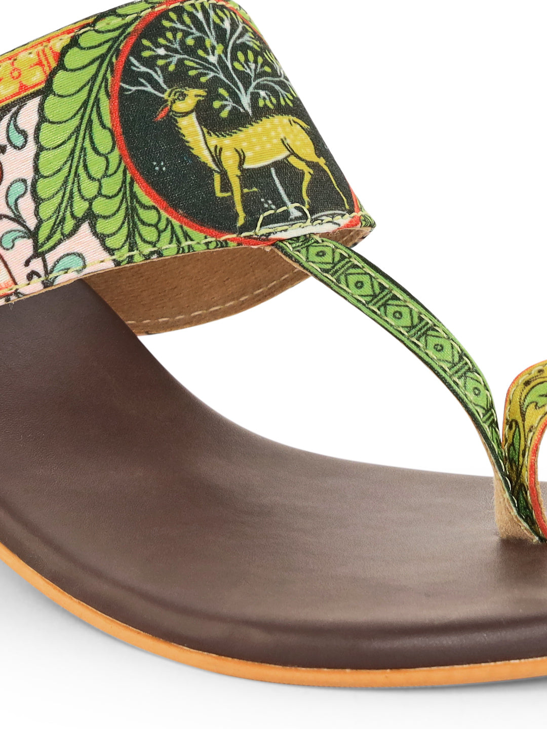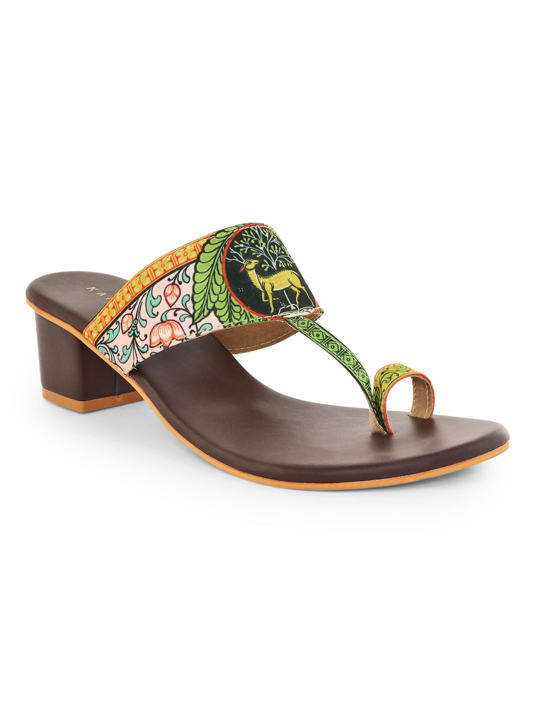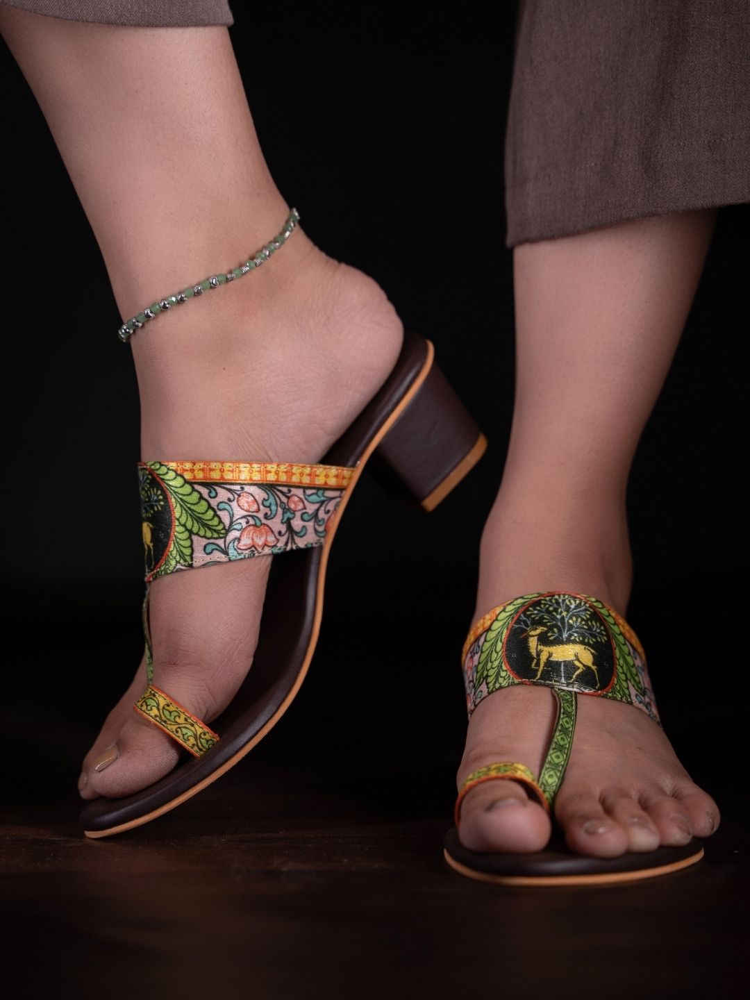Experience the elegance of nature with Deserted Deer Kolhapuris. Slip into these intricately crafted open-toe kolhapuri heels, hand-painted with Pattachitra artwork for a unique and sophisticated look. Enjoy superior comfort and fit with lightweight, slip-resistant soles, perfect for the day or night. A luxury artwork for your feet.