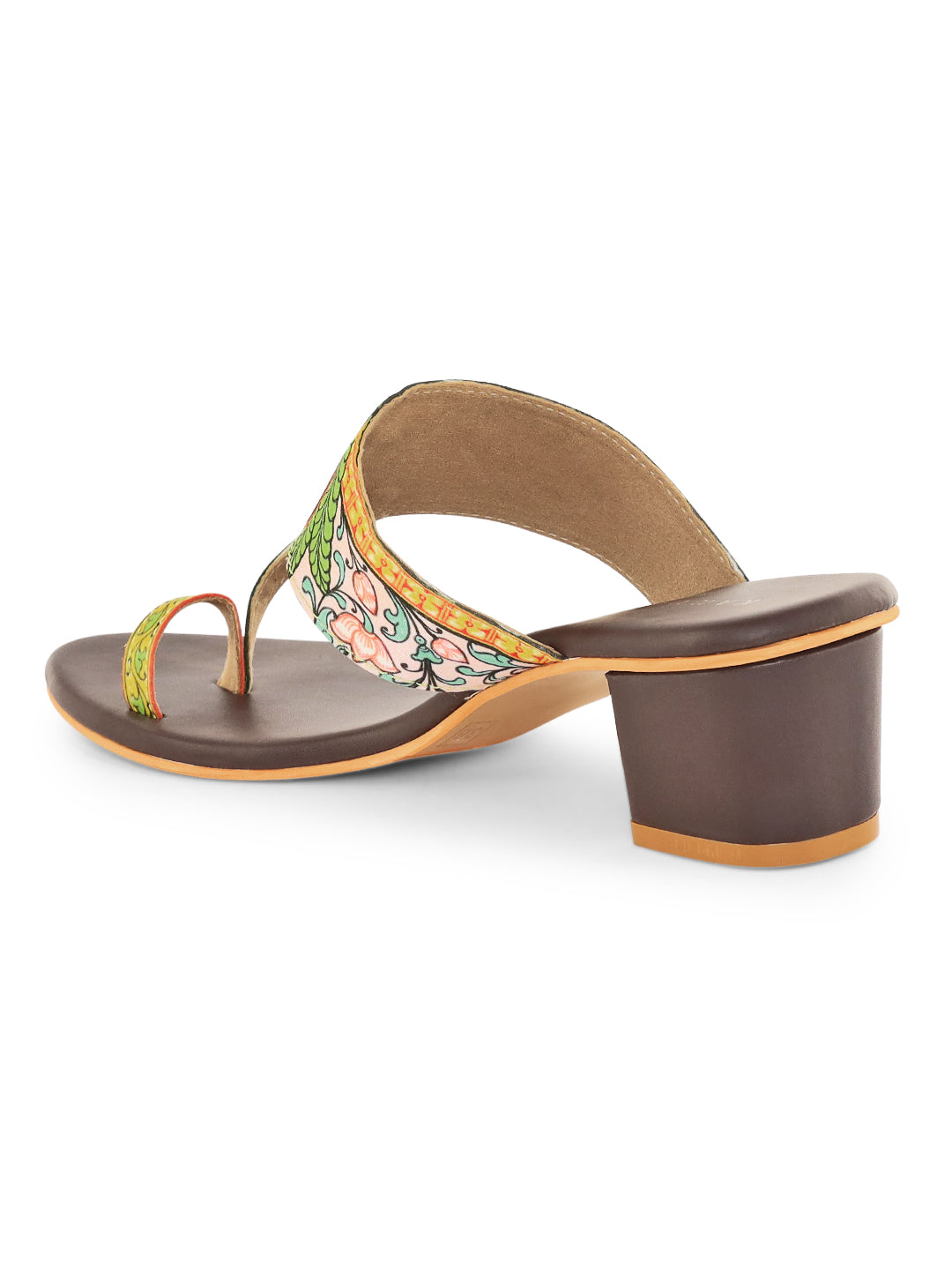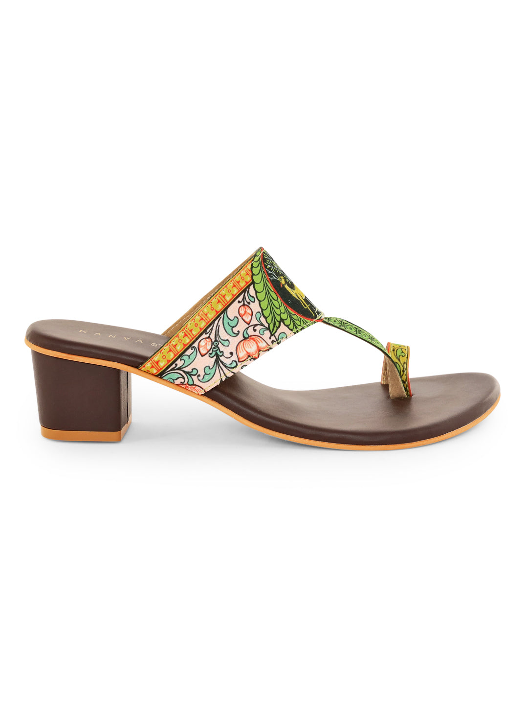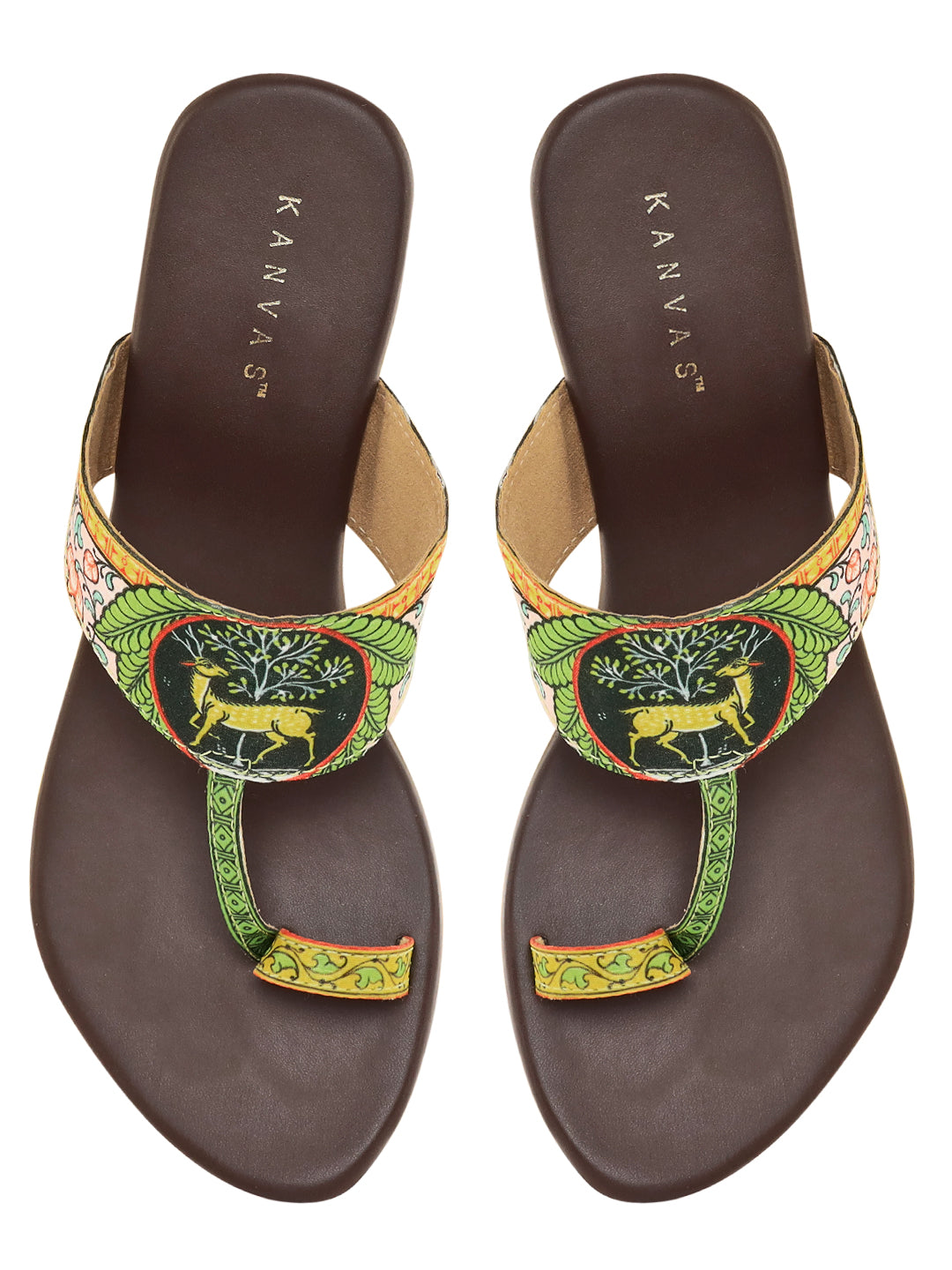 Experience the elegance of nature with Deserted Deer Kolhapuris. Slip into these intricately crafted open-toe kolhapuri heels, hand-painted with Pattachitra artwork for a unique and sophisticated look. Enjoy superior comfort and fit with lightweight, slip-resistant soles, perfect for the day or night. A luxury artwork for your feet.