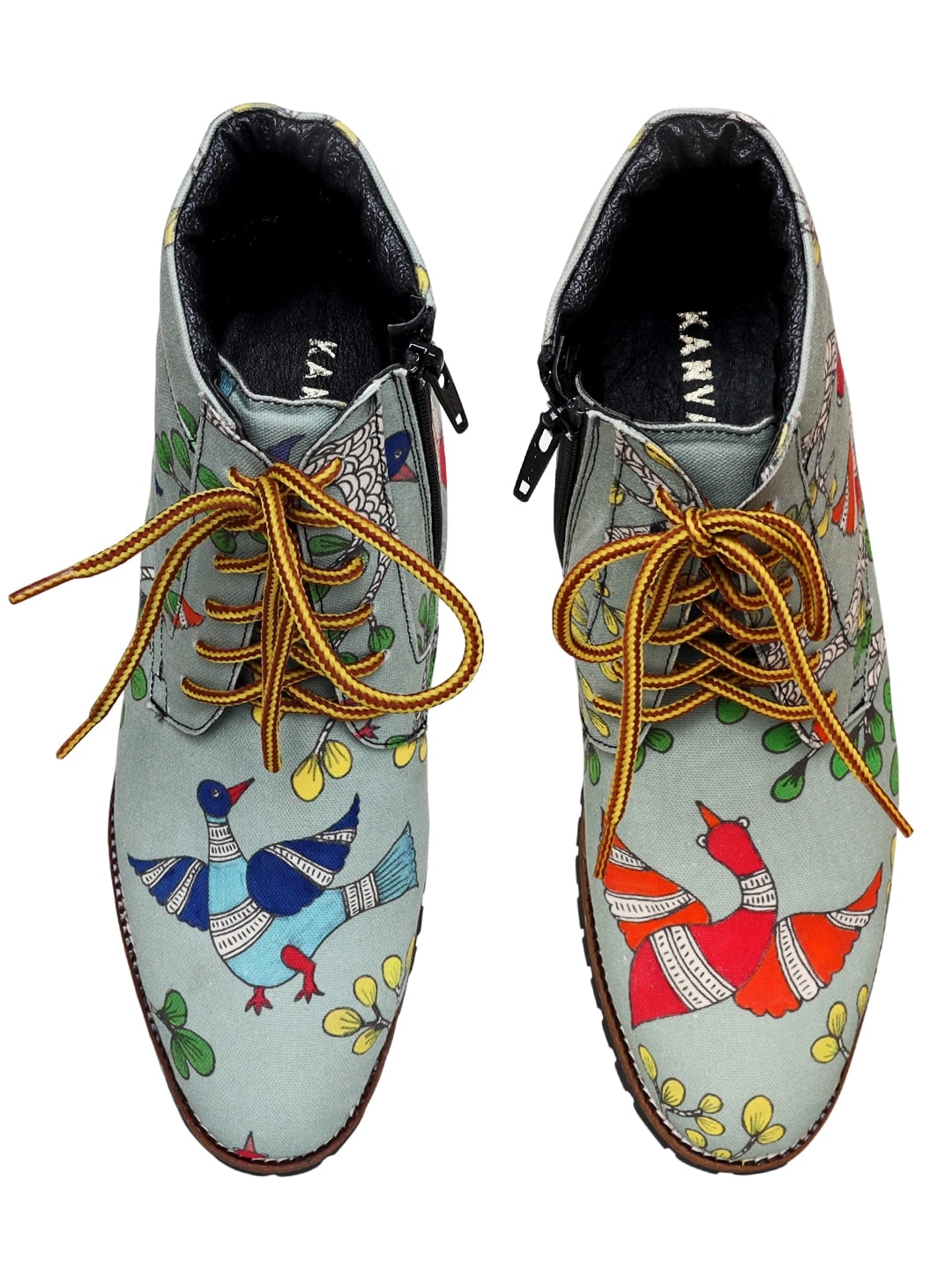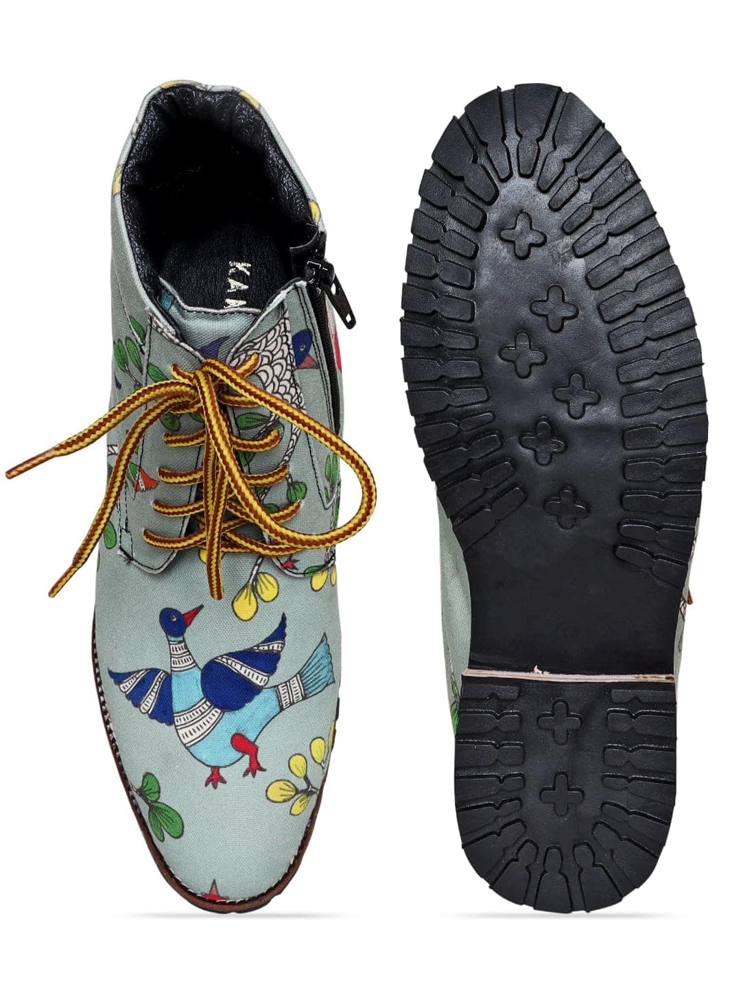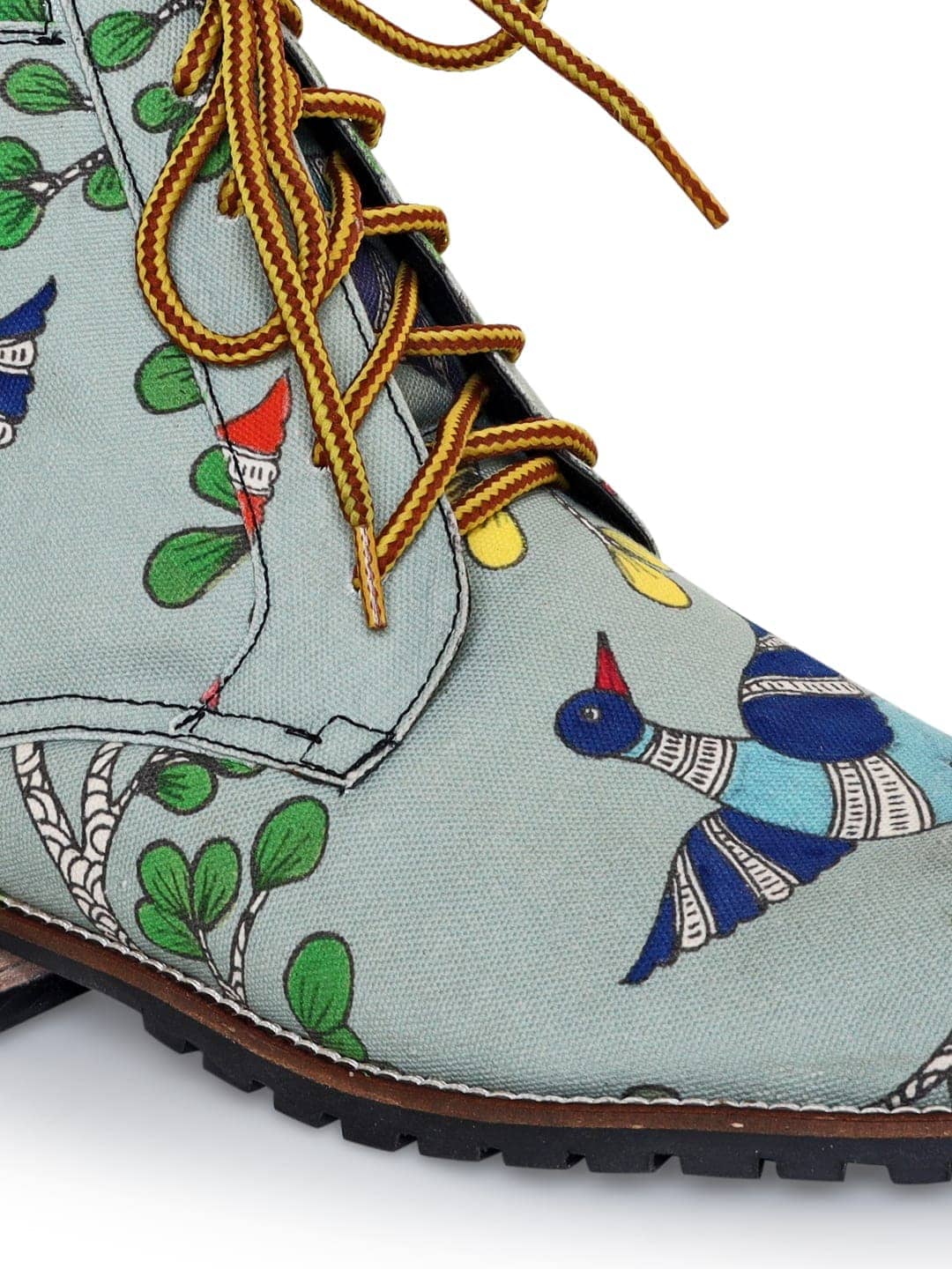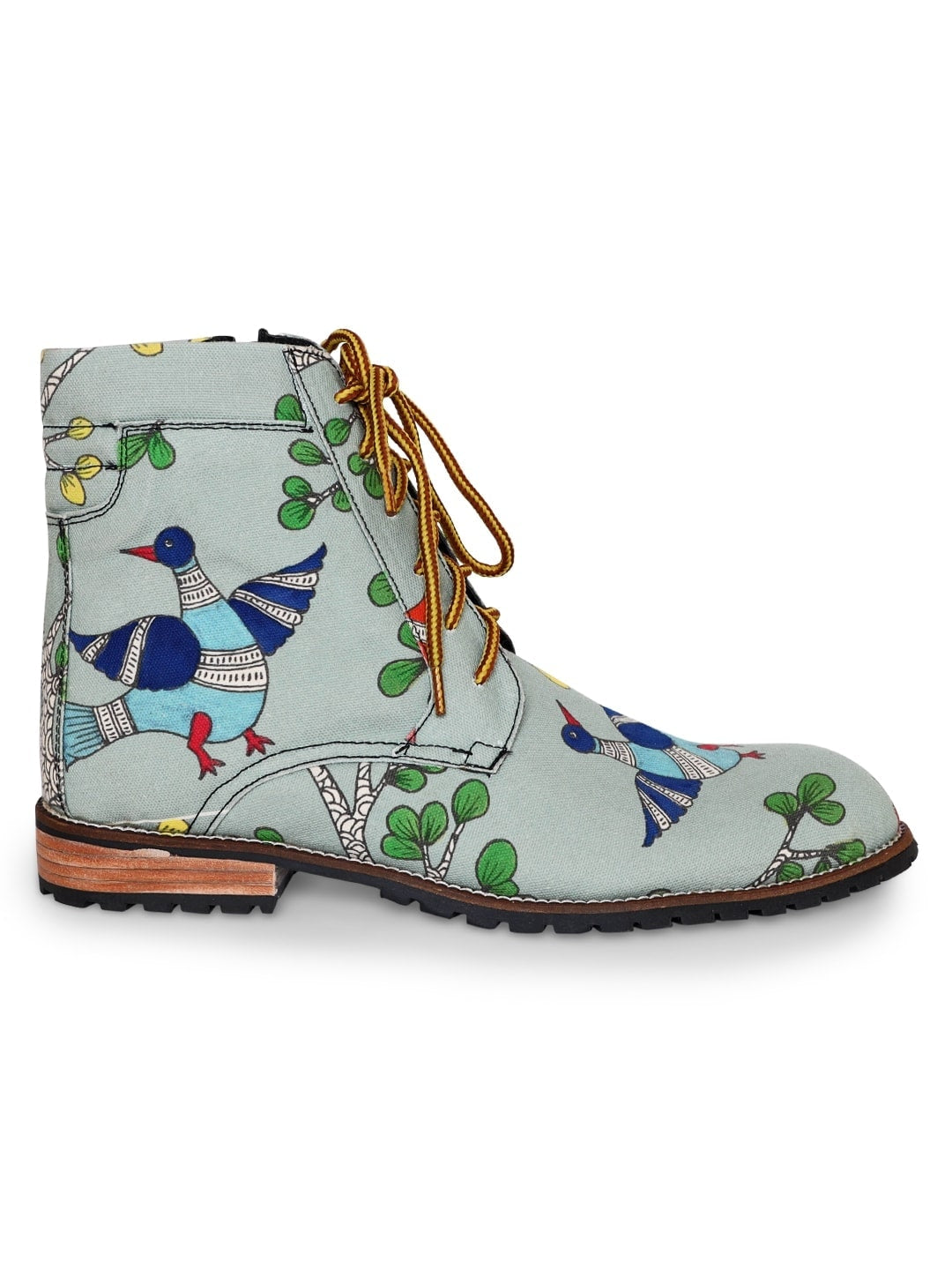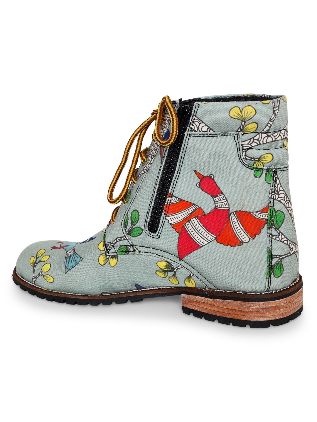 Experience the ultimate in style and comfort with our Badass Country Creature Unisex Boots. These boots feature a hand painted design and a unique Gond Print, adding a touch of artistic flair to your wardrobe. With a convenient side zip and durable canvas material, these boots are perfect for any adventure.