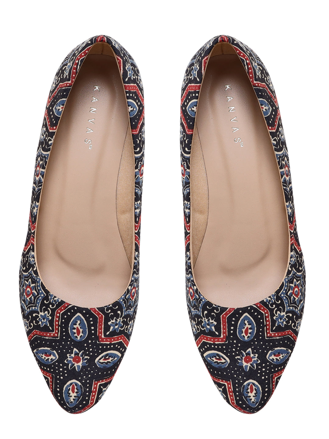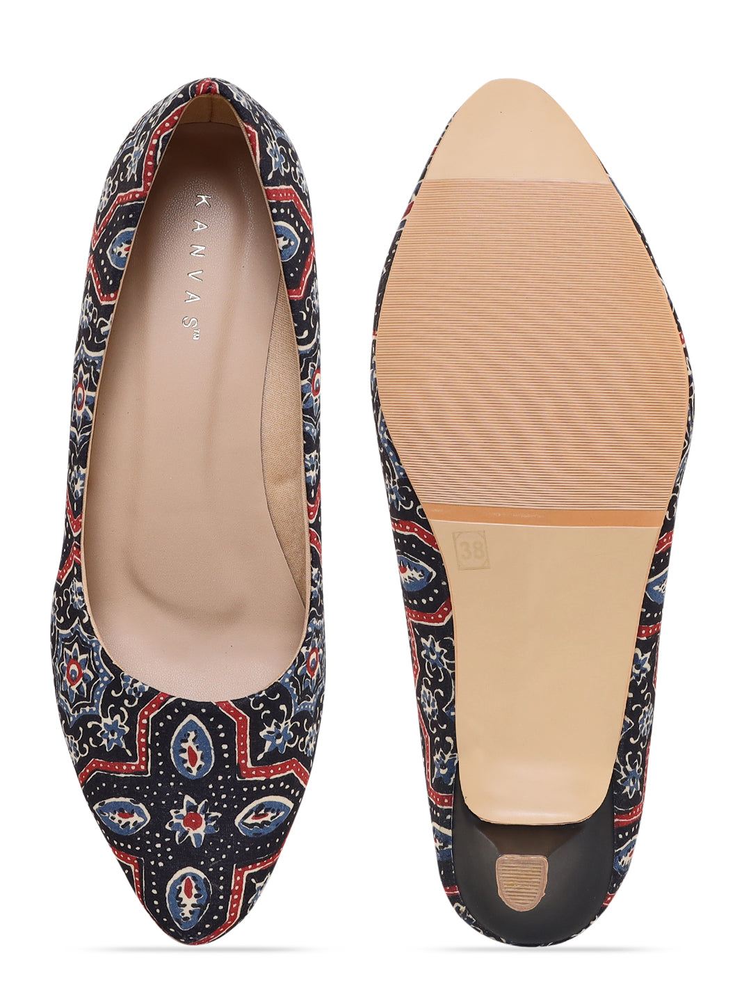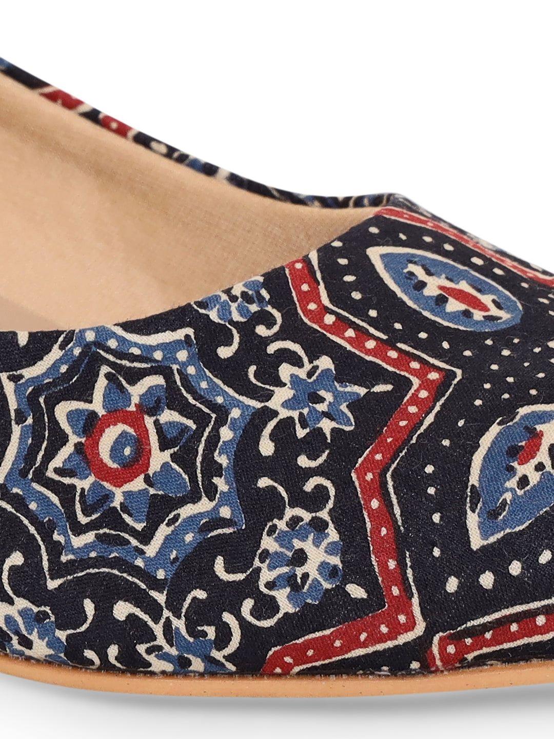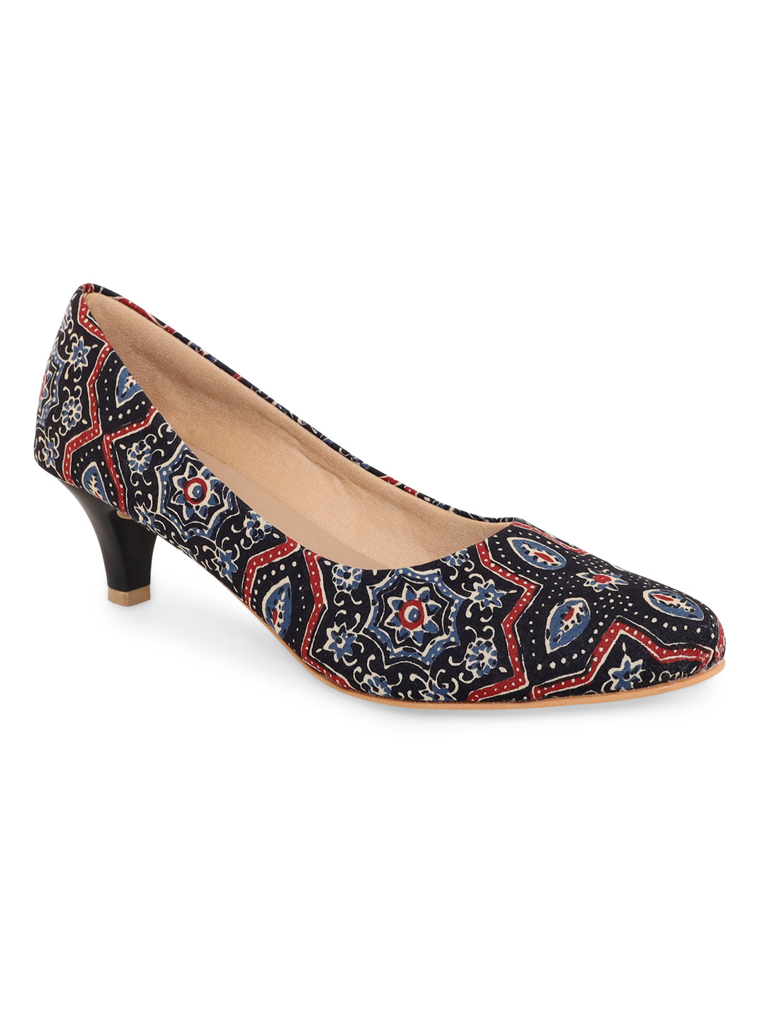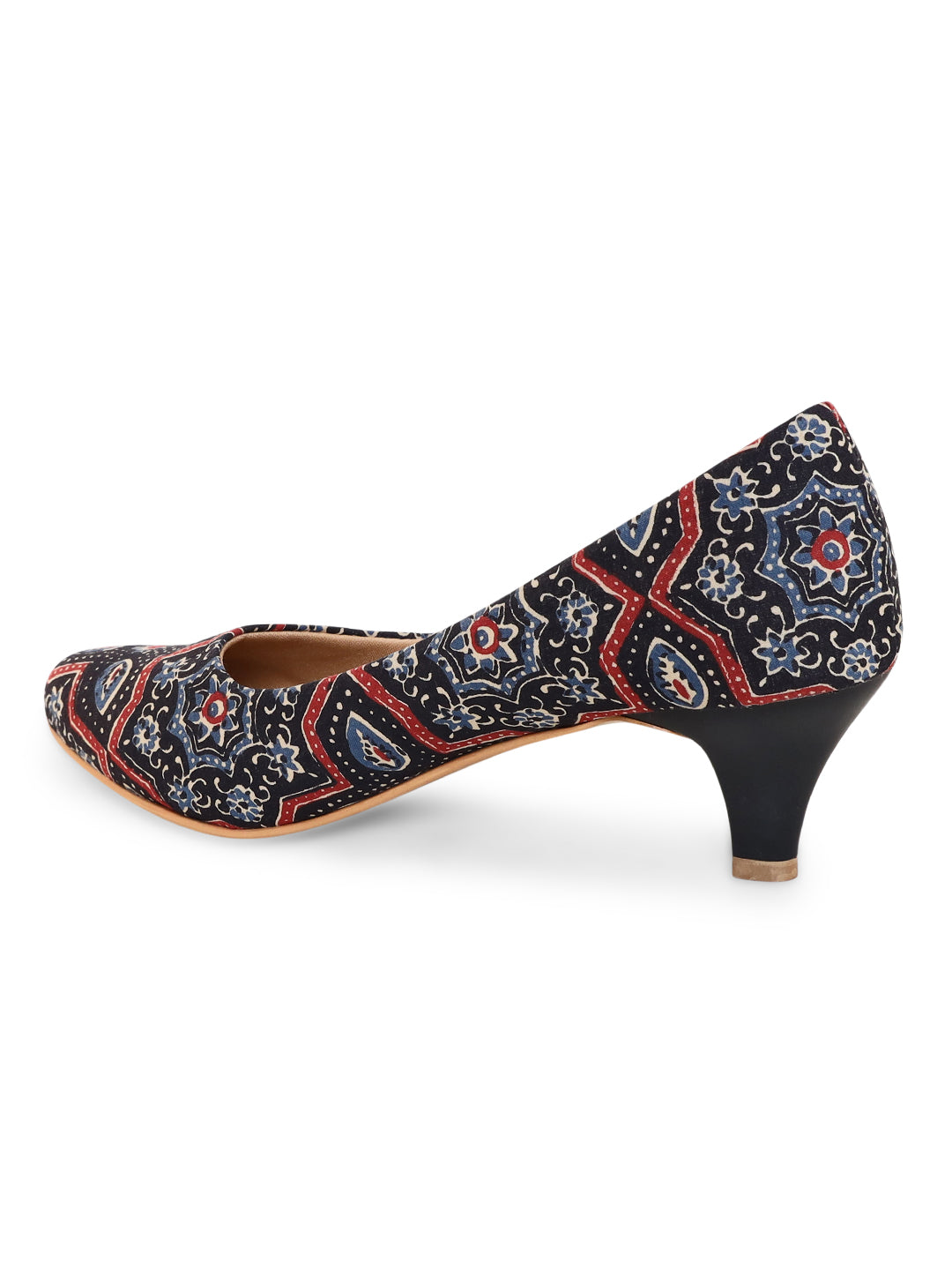 Black remains the most classic colour of all time and these Ajrakh printed kitten heels are a must have for you. These low stiletto heels provide the perfect comfort to walk over any surface without the fear of any slip, due to meticulously crafted sole. The red and blue detailing of the print makes it stand apart from all the other black pairs you may own. The print developed by the villagers in different cities in India and is printed with natural dye.
