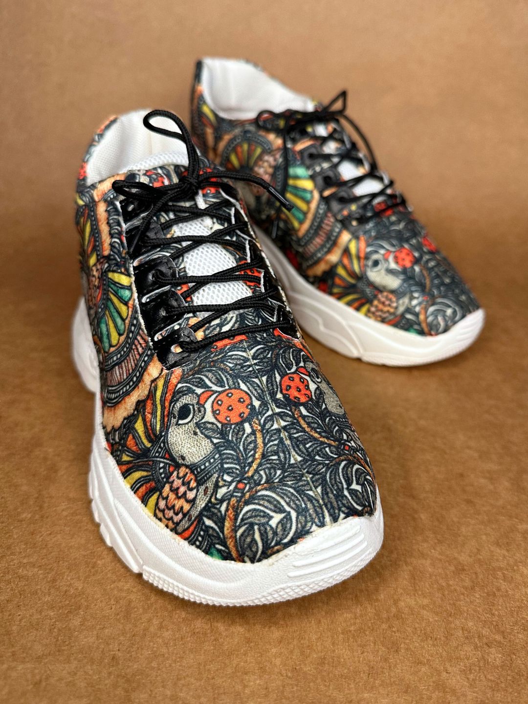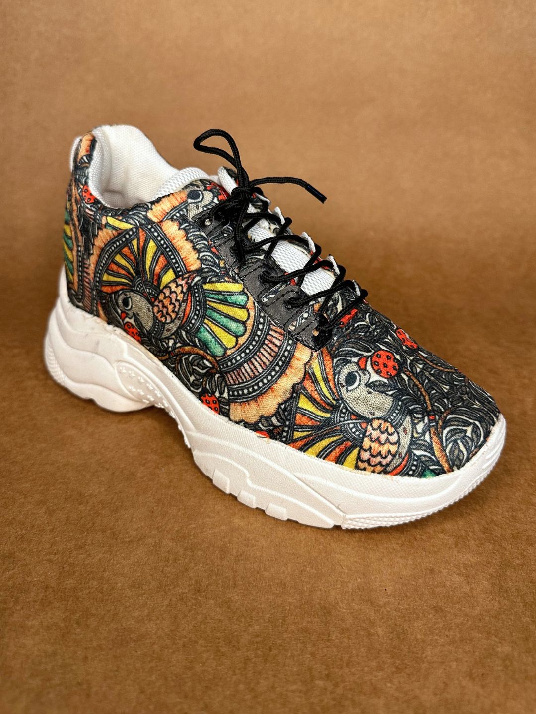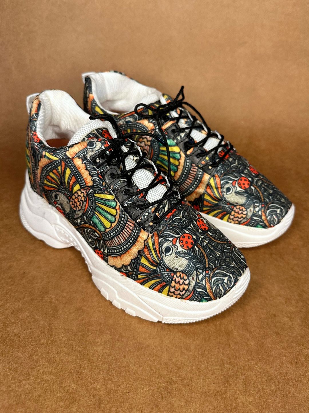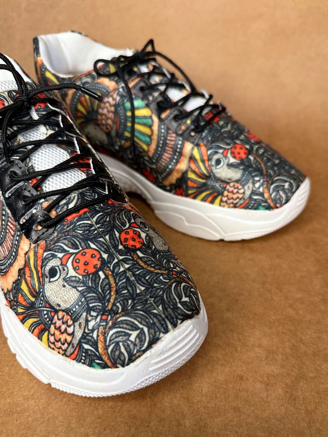 Elevate your style with our Black Madhubani Art Printed Work Sneakers. The intricate Madhubani print adds a touch of class and uniqueness to these comfortable, made-to-order shoes. Step out in these exclusive sneakers and make a statement with every step.