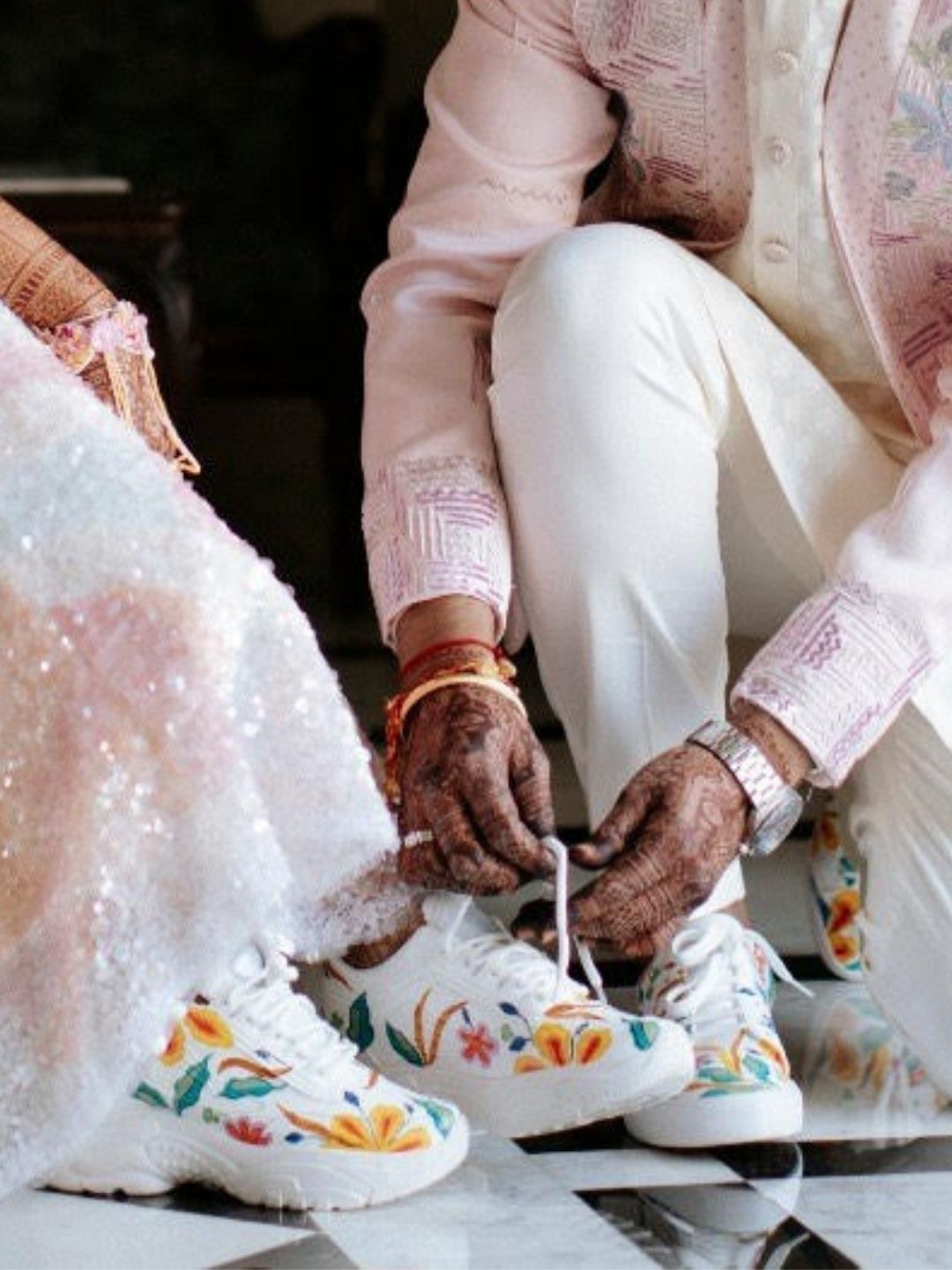 Swap your stilettos or juttis for these cool kicks by Kanvas. When it comes to fashion for your big day each and every couple turn into super ninjas! Everything from clothes to jewelry, hair and make-up is taken care of in absolute sync. But we often forget that the ceremonies and events are gonna be tiring and long, so why should your feet suffer in uncomfortable basic shoes when you can customize one just to match your lehenga or your sherwani. Yes! You heard it right. Be it sangeet, Mehendi or your wedding day we've got you covered with some desi-style kicks you can have a blast in.