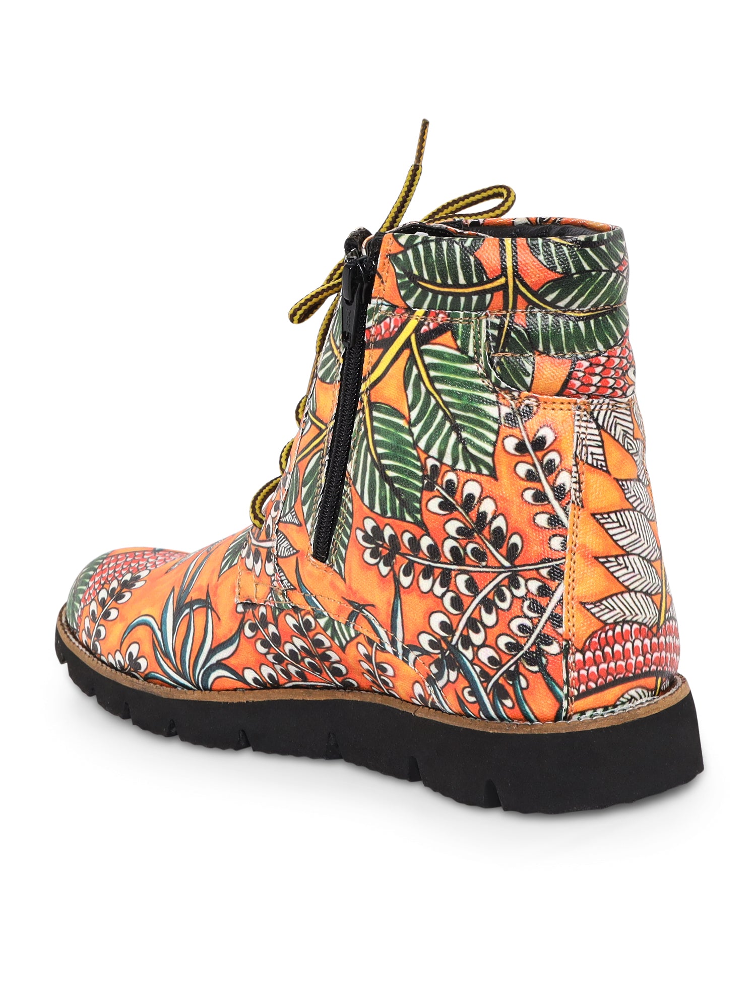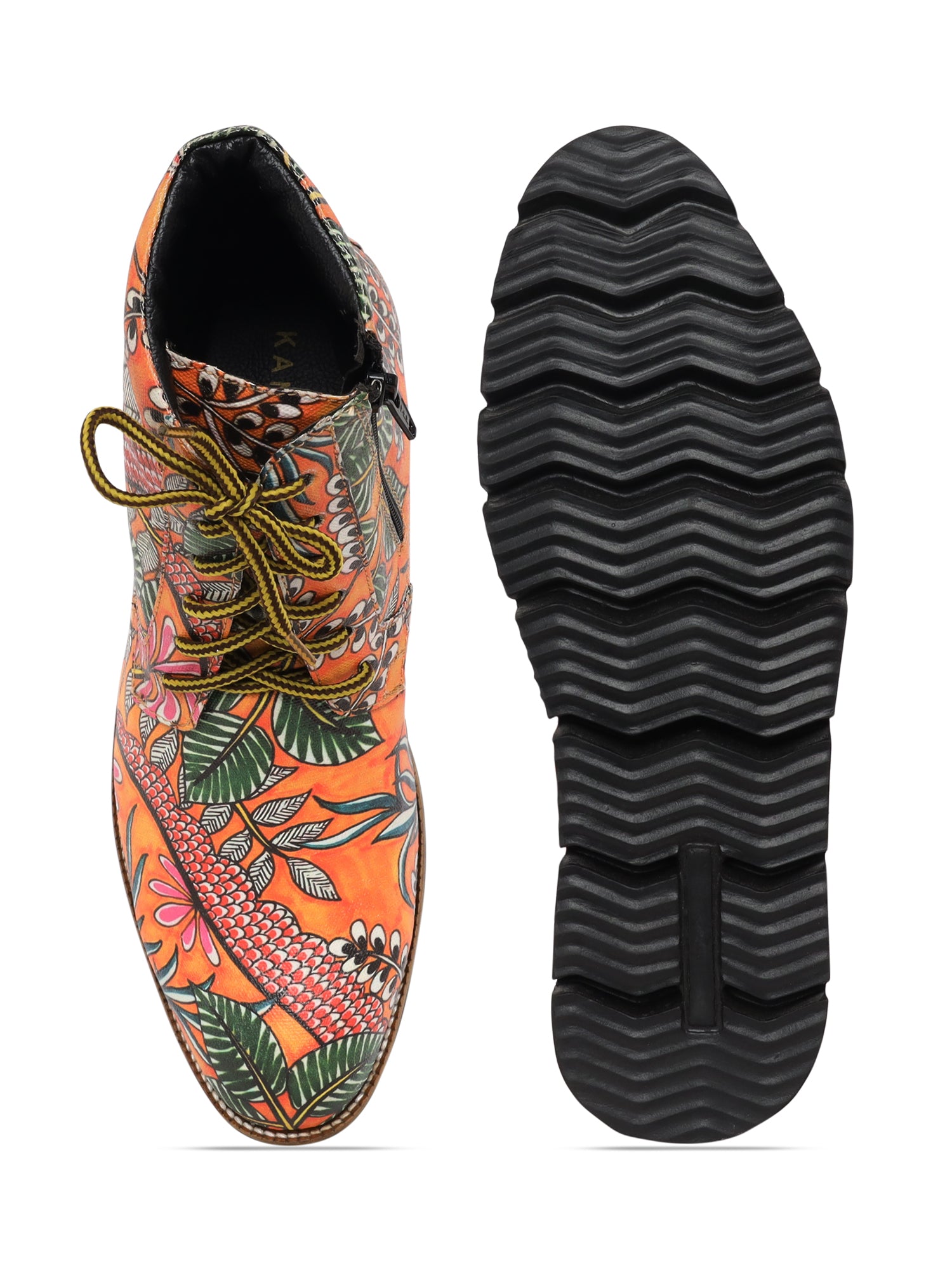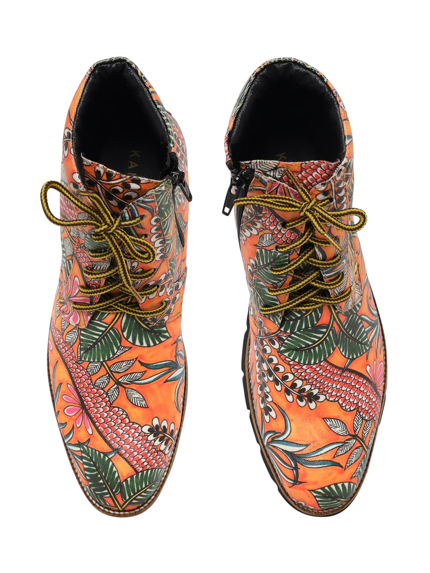 Kanvas is bringing their fresh spin to summer shoes in their exclusive collection. Kanvas riffs on patterns and colors easily and this collection packs bright prints, mixing leaf prints with a dusky orange base for a creative and bright take on boots familiar to the brand's ethos.