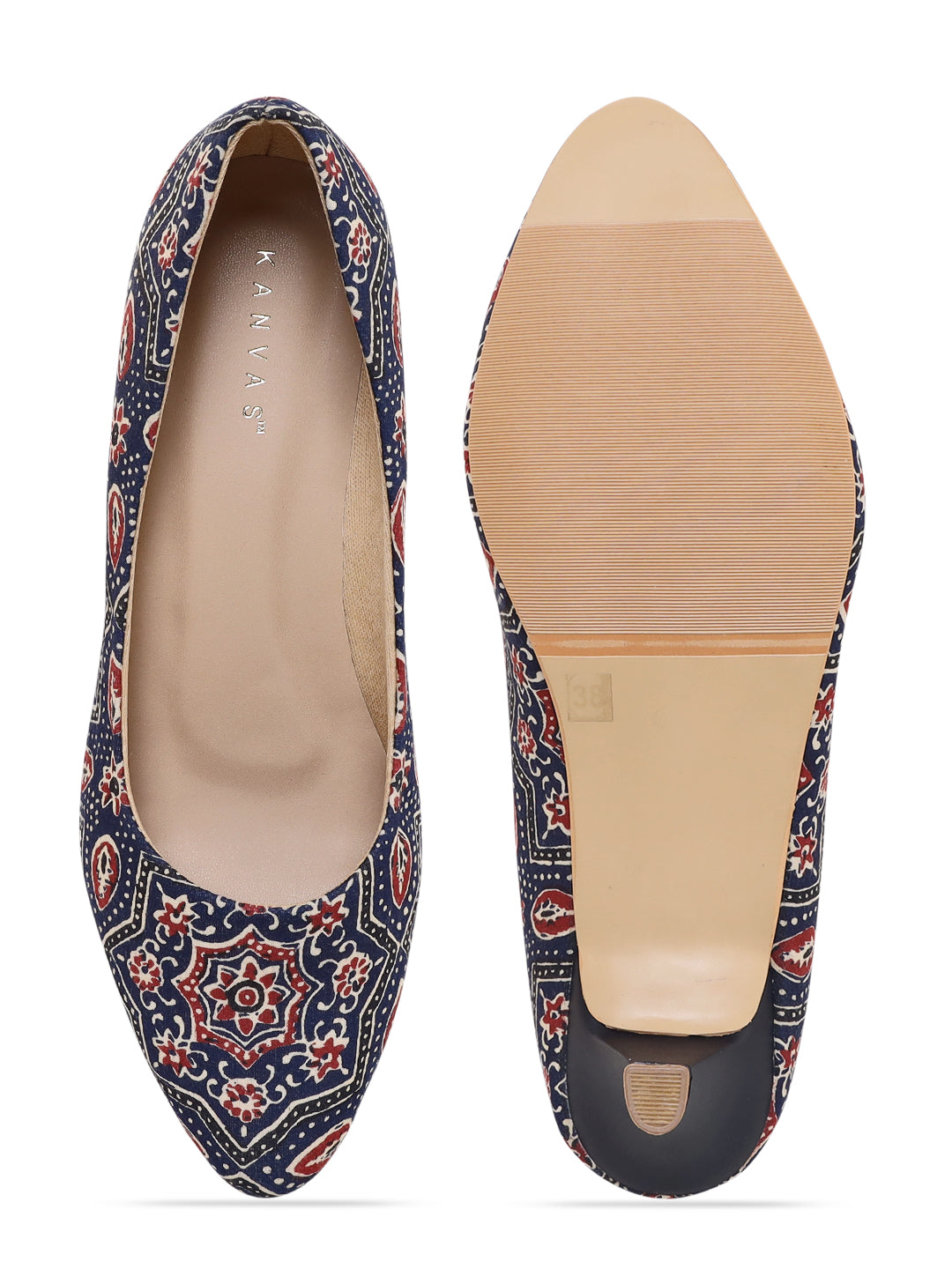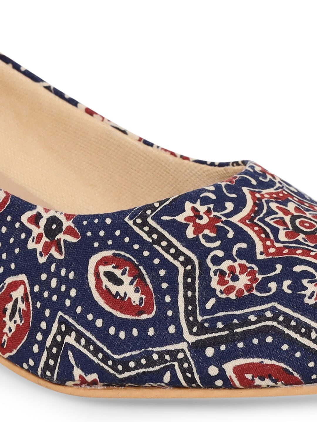 These low stiletto heels provide the perfect comfort to walk over any surface without the fear of any slip, due to meticulously crafted sole. Because of its traditional patterns and red and white detailing, it can be paired with any outfit. The print developed by the villagers in different cities in India and is printed with natural dye.